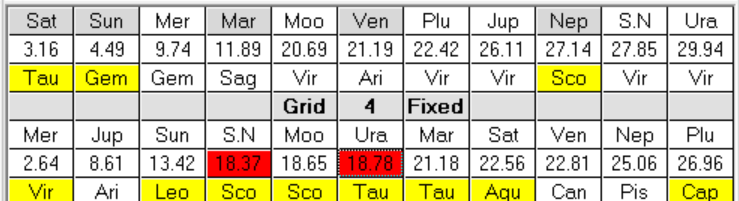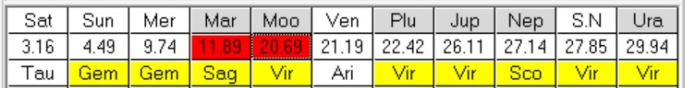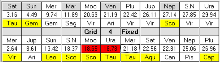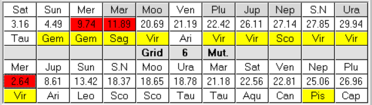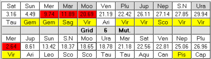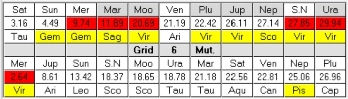 In the graphics seen below, natal positions are represented in the first 3 rows while transit positions are represented in the bottom 3 rows.